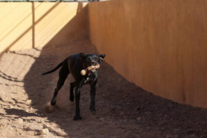 Als Pointer hat Betty ganz rassetypischen Jagdtrieb und ist draußen ständig auf der Suche nach einer Fährte und deshalb ziemlich rastlos. Zum Glück findet sie vor dem Tierheim aber nicht allzu viel, was sie jagen könnte. Als gezüchteter Vorstehhund bleibt sie stehen, wenn sie etwas Interessantes sieht, und fixiert es. Da wir aber schon fleißig mit ihr geübt haben, ist sie dennoch gut abrufbar und hört auf ihren Namen. Selbst wenn sie bereits im Jagdmodus ist, reagiert sie sofort auf unsere Rufe und dreht sich zu uns um.
