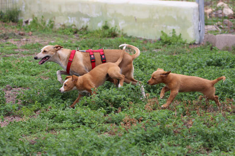 Wie sich Cinnamon außerhalb des Tierheims verhält, können wir aktuell noch nicht genau sagen. Momentan ist sie voll und ganz mit der Betreuung ihrer Babys beschäftigt und verlässt den geschützten Bereich nicht. Um die Welpen vor möglichen Krankheitserregern zu schützen, verzichten wir derzeit bewusst auf Spaziergänge außerhalb des Tierheims. Sobald ihre Welpen etwas älter sind, werden wir sie natürlich auch an neue Situationen heranführen und berichten, wie sie sich dabei verhält. Dabei kann sich natürlich auch noch typisches Podenco-Verhalten zeigen – beispielsweise ein vorhandener Jagdtrieb, der sich oft erst außerhalb des Tierheims bei Spaziergängen richtig bemerkbar macht.